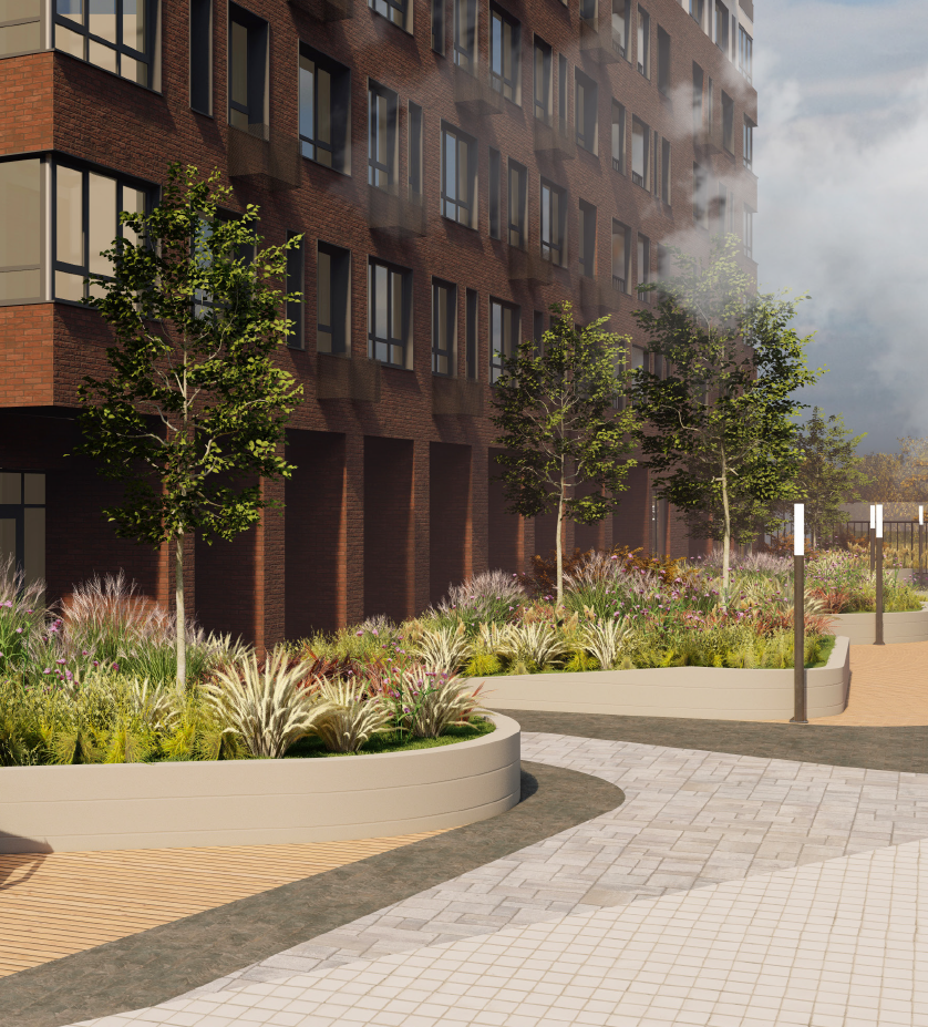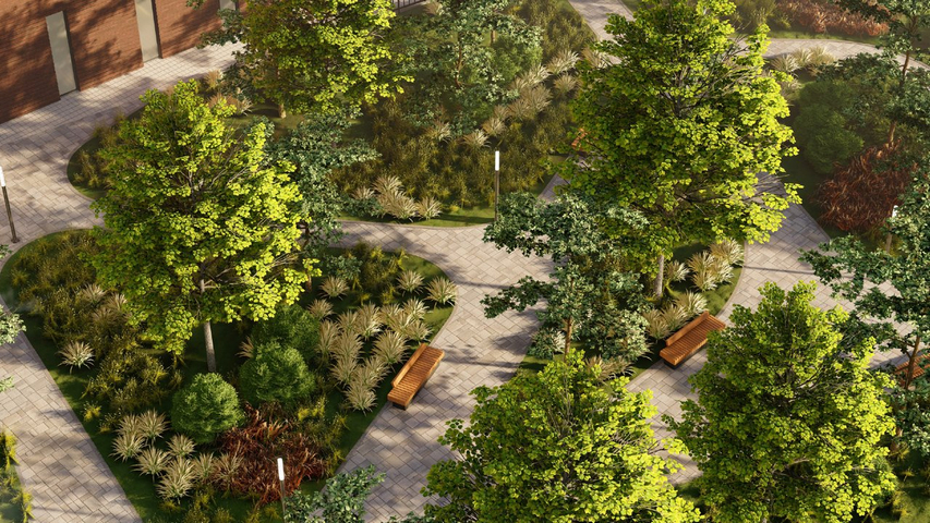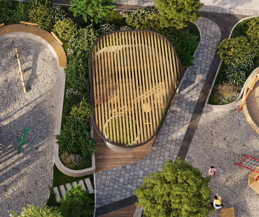Во дворе мы оборудуем несколько приватных зон, которые позволяют одновременно уединиться разным группам людей. Мама с ребенком сможет найти свое место, подростки будут находиться во втором, а одинокий любитель чтения выберет третью локацию.
