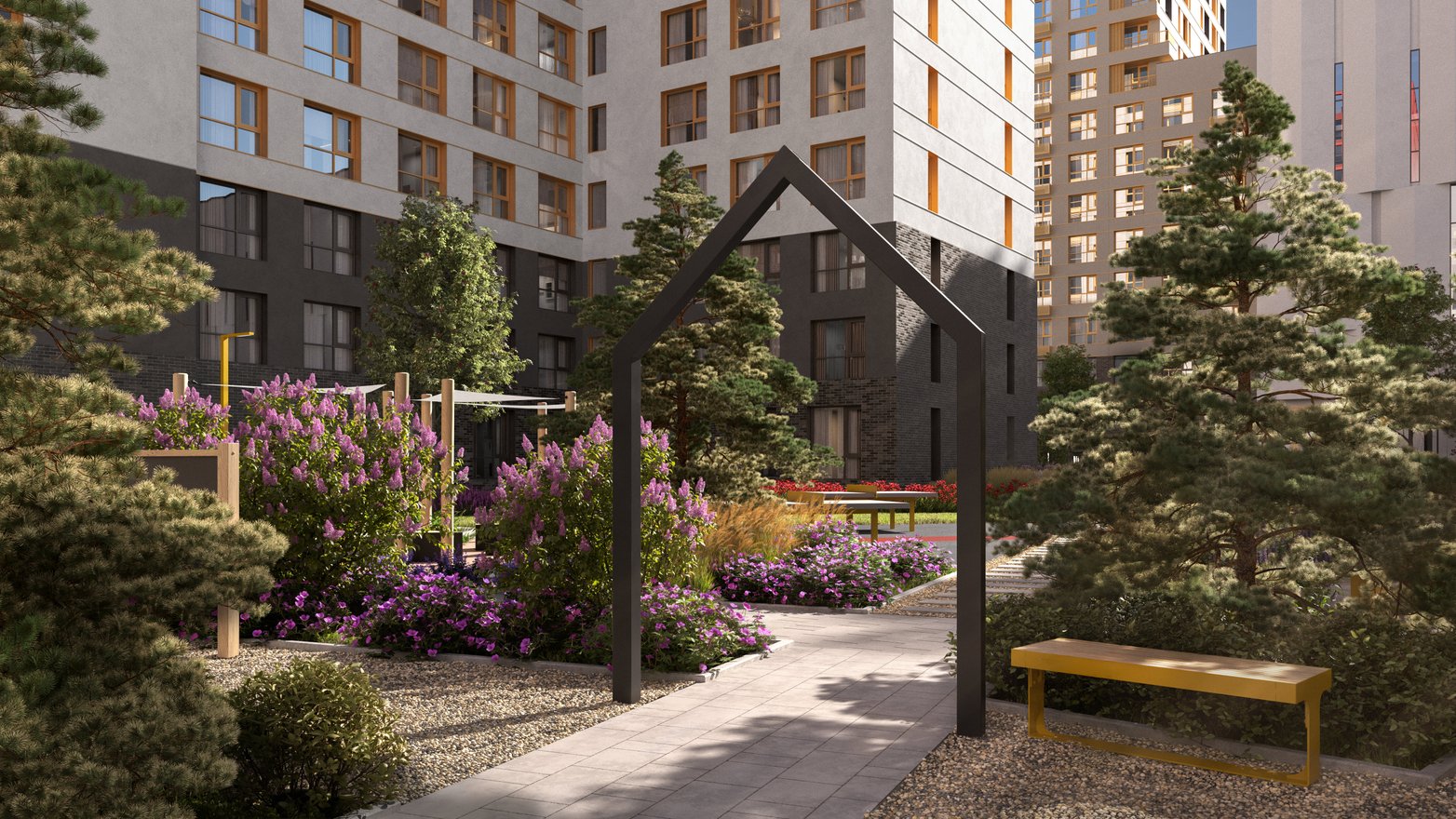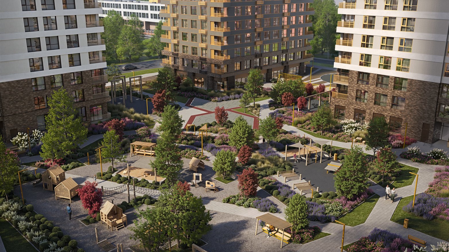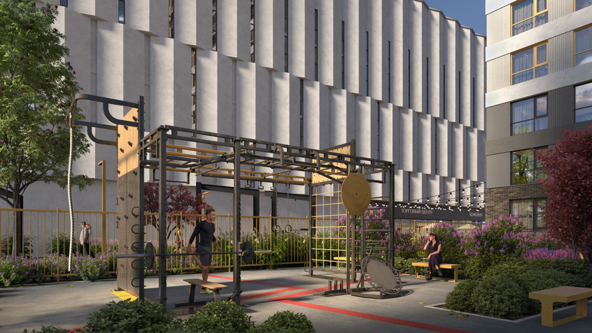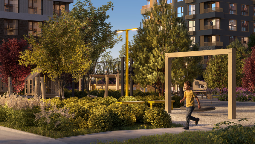 Двор устроен как «карманный» городской парк. Включает разные зоны, приватную и общую части. Благоустройство у домов выходит и за территорию квартала. Есть главная площадь для прогулок, зоны для спорта, террасы и места под навесами для релакса, прогулочный бульвар со своим зеленым сквером.