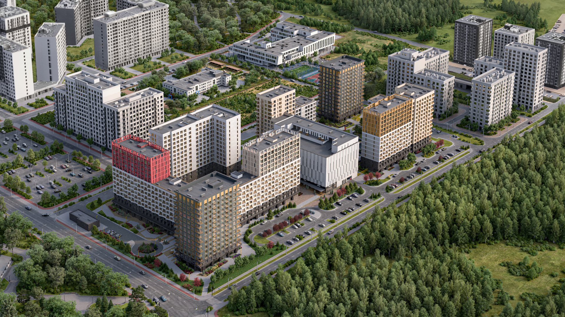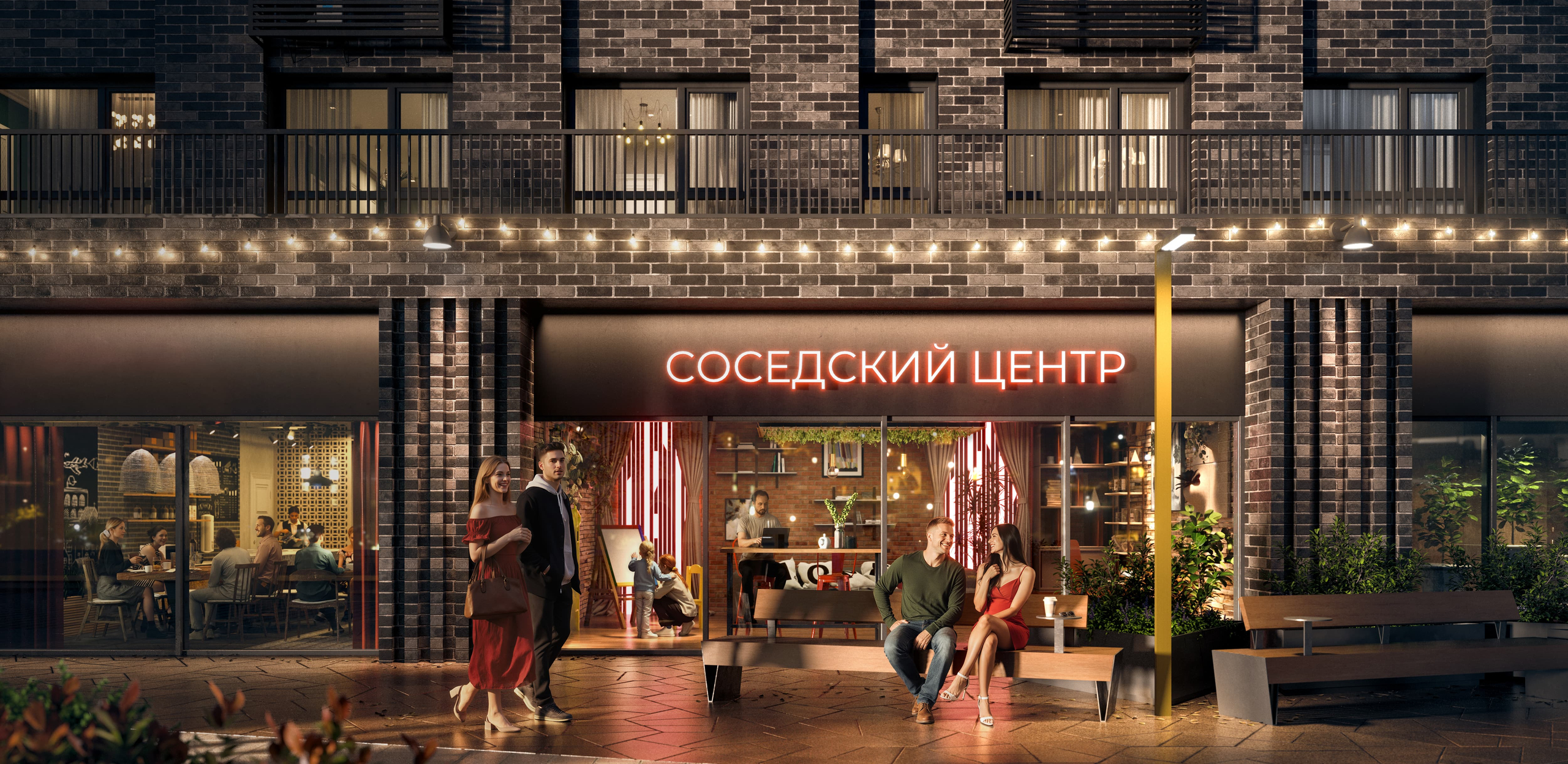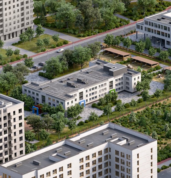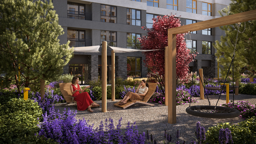 Двор устроен как «карманный» городской парк. Включает разные зоны, приватную и общую части. Благоустройство у домов выходит и за территорию квартала. Есть главная площадь для прогулок, зоны для спорта, террасы и места под навесами для релакса, прогулочный бульвар со своим зеленым сквером.